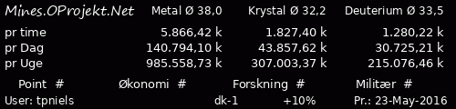 | Planetnavn | Metalmine | Produktion | Crysmine | Produktion | Deuteriummine | Produktion | Ø |